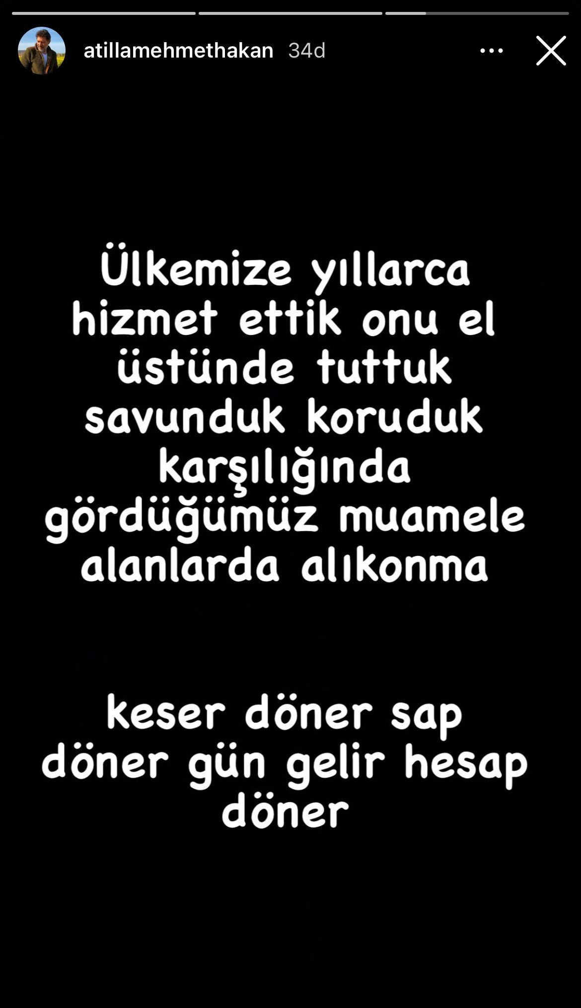 Atilla, sebebin belli olmadığını belirtti. Atilla, bir diğer paylaşımında, “Ülkemize yıllarca hizmet ettik, onu el üstünde tuttuk savunduk koruduk, karşılığında gördüğümüz muamele alanlarda alıkonma. Keser döner sap döner, gün gelir hesap döner” yazdı.